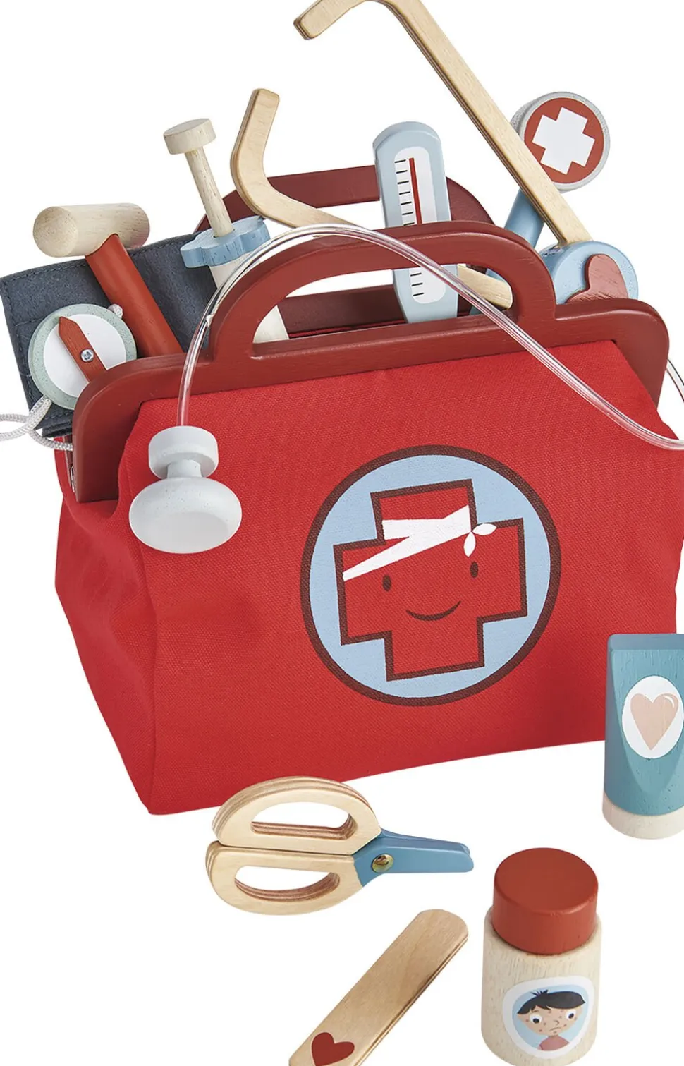 Indhold: Stetoskop, saks, ørekikkert, sprøjte, knæhammer, blodtryksmåler, stofmaske, plastre, klistermærker med tilstand og behandling, patienttavle, termometer, fladpind, en flaske piller og en tube salve.