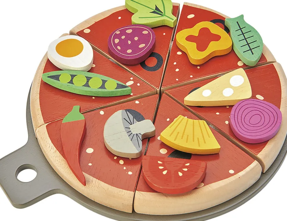 Sammensæt en pizza, bag den i en legeovn og server på det medfølgende fad.