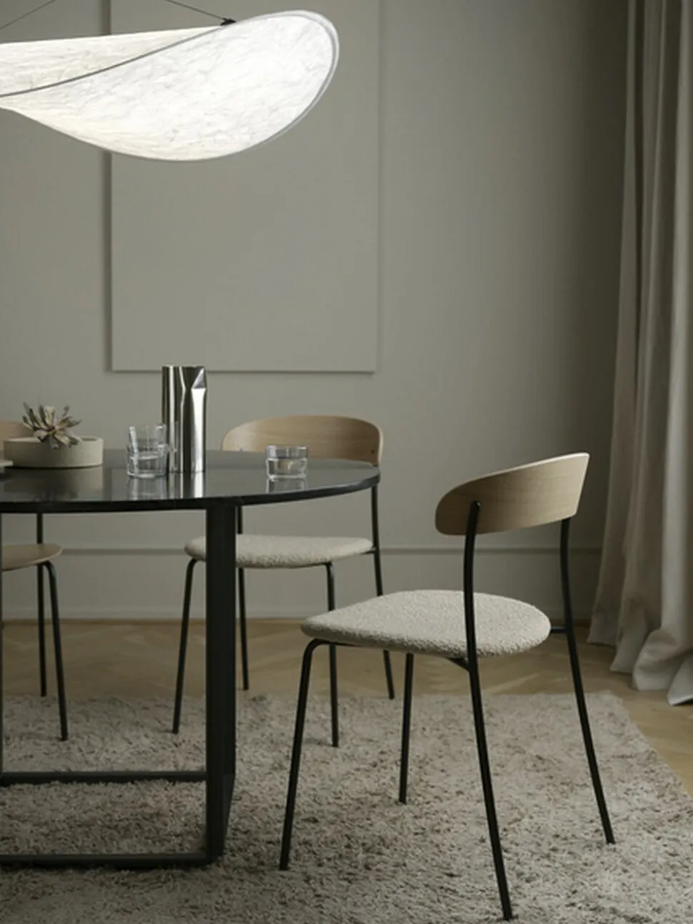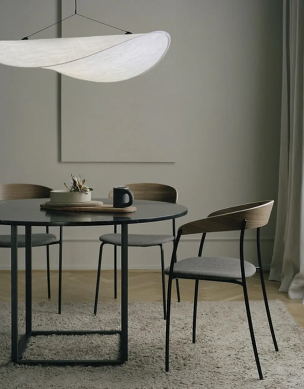 Tense pendel strækker sig ud som en blød sky. Lampens overflade er fremstillet i et materiale der i sin farve og struktur, minder og et stykke hvidt papir. Materialet er i virkeligheden det innovative materiale