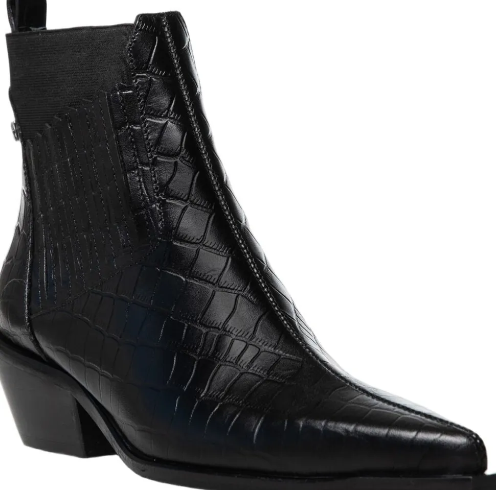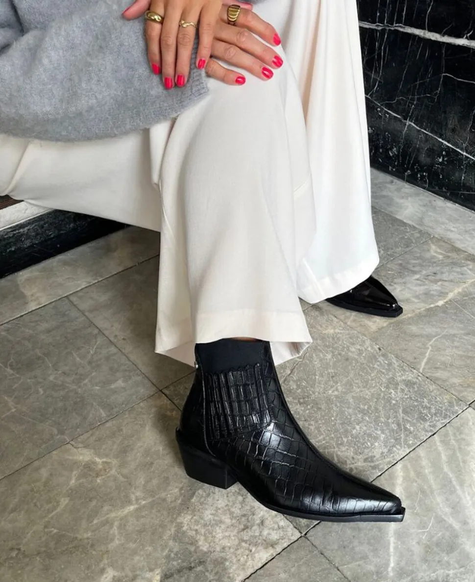En stilfuld støvle i skind med croco-præg og et markant western-inspireret design. Den spidse snude, de elastiske paneler i siderne og den rå hæl giver et edgy twist, som gør støvlen til et statement-piece i garderoben. Den solide TPR-sål og bløde Copenhagenshoes foam indersål sikrer komfort hele dagen.