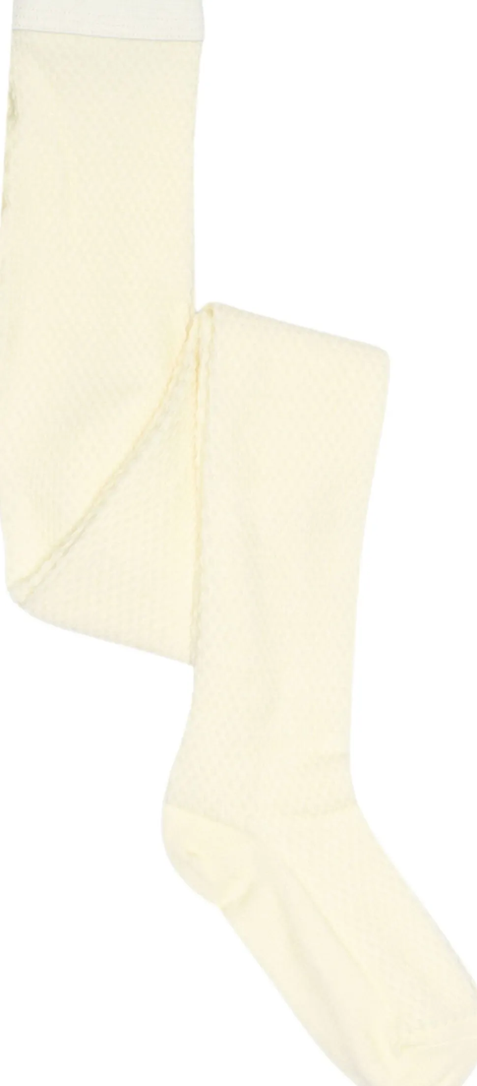 Fineste, mønstrede superwash-uldtights i et firkantet mønster på benene. Elastik i taljen og et g