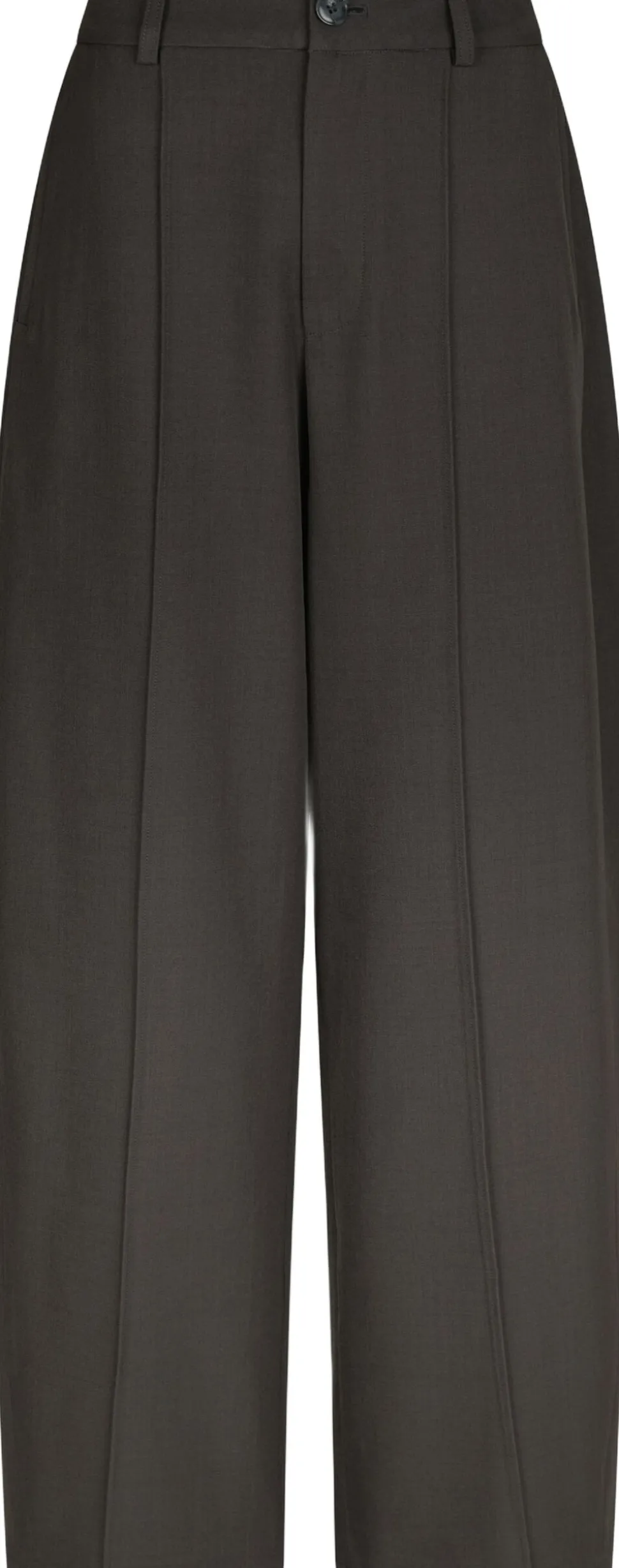 Barrel habitbukser med mellemhøj talje. Bukserne har buede ben med vidde, sidelommer og lukkes med skjult lynlås samt en knap. De har en løs pasform. Modellen bærer størrelse 36.