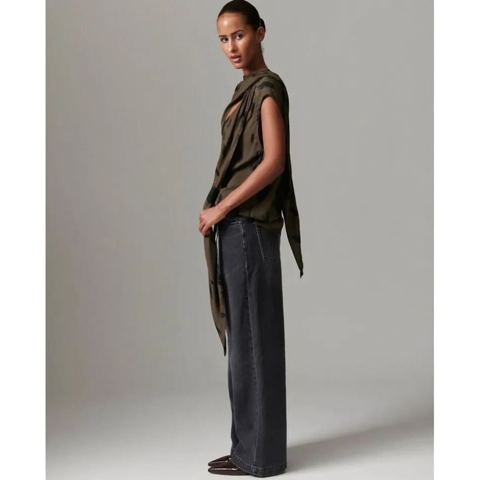 Denne top uden ærmer har et forlænget halstørklæde, der draperer asymmetrisk hen over brystet. Toppen har en almindelig pasform