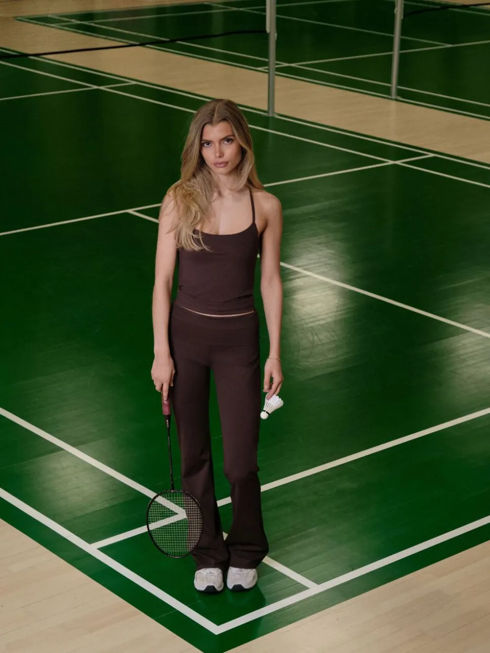 Kort top uden ærmer. Toppen har rund halsudskæring, tynde stropper, der krydser på ryggen, samt forede skåle. Den er lavet i et strækbart materiale og har en tætsiddende pasform. Modellen er iført størrelse 36.