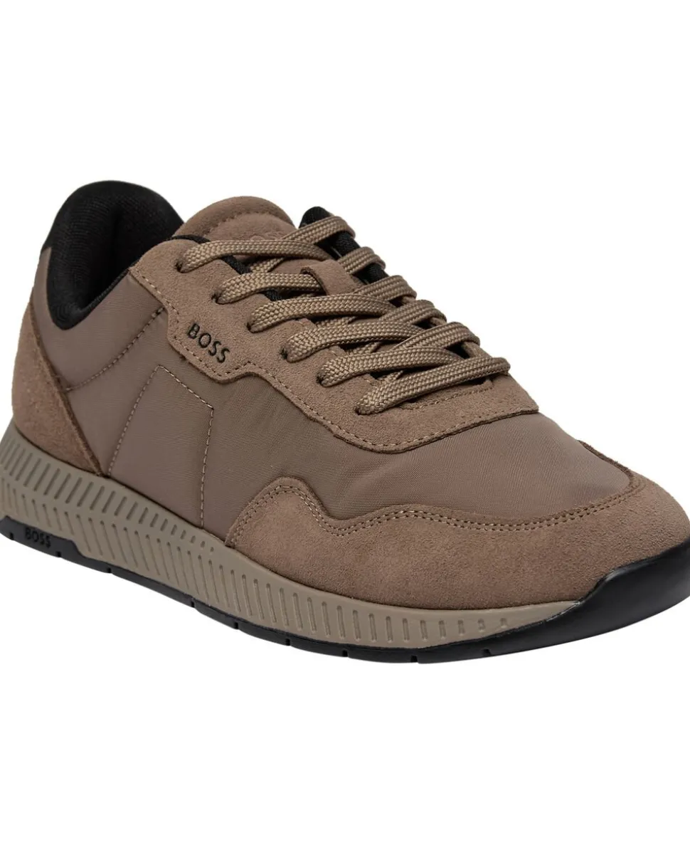 Disse sneakers fra BOSS Menswear har en polstret overdel i mat nylon med bløde ruskindsbelægninger, der giver et sporty look. Karakteristisk ribsål