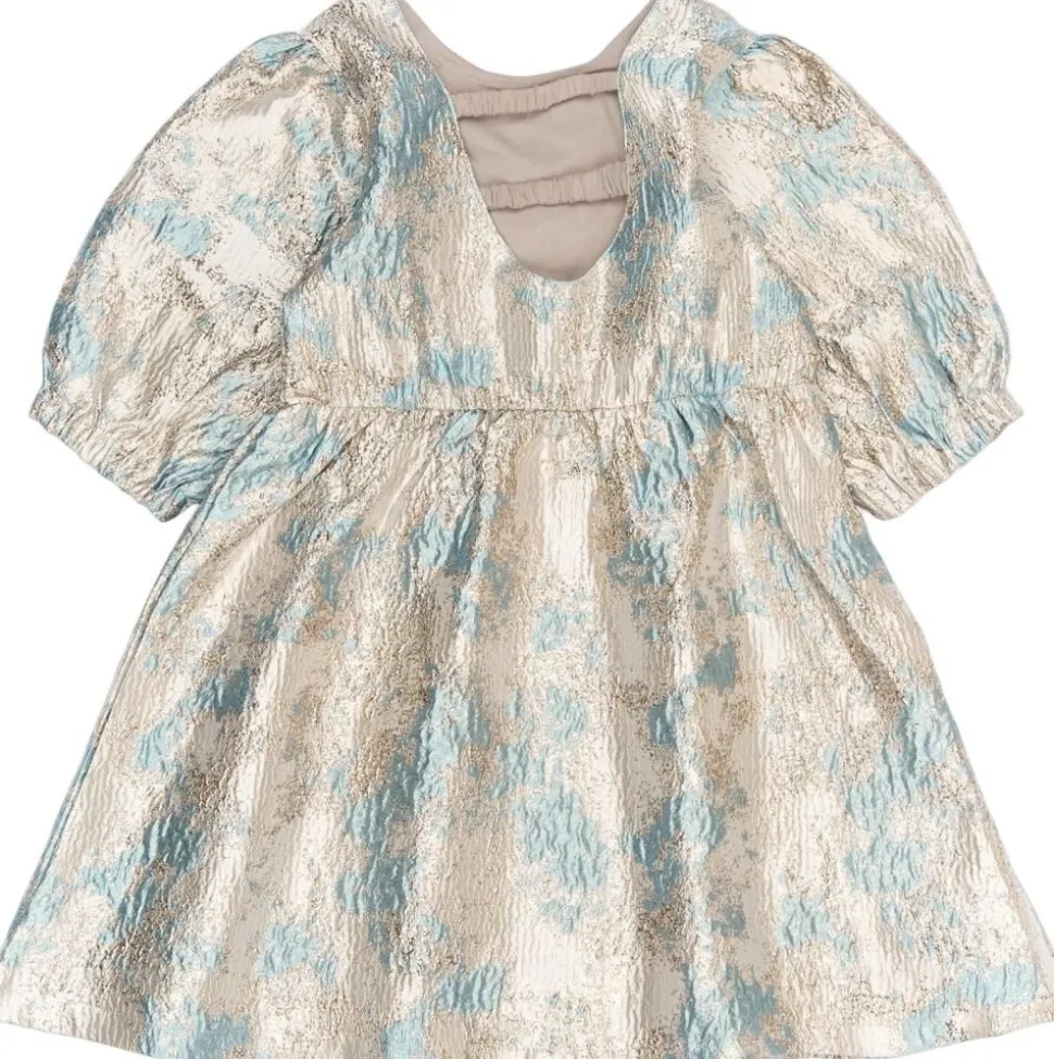 En smuk og elegant kjole fra THE NEW med et eksklusivt brokademønster i gyldne og blå nuancer. Kjolen har en let A-formet silhuet, der skaber en fin og luftig bevægelse. De korte pufærmer og den elastiske talje tilføjer et feminint touch og en behagelig pasform. Som en ekstra detalje har kjolen en lille åbning på ryggen med elastik, der giver et stilfuldt og moderne udtryk. – Let A-formet pasform. – Skinnende brokademønster i gyldne og blå nuancer. – Korte pufærmer for et elegant look. – Elastisk talje for en behagelig og fleksibel pasform. – Lille åbning på ryggen med elastik for en moderne detalje.