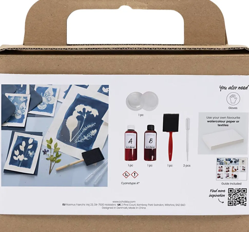 Med dette kit kan du nemt prøve kræfter med cyanotypi. Indeholder alt det tilbehør du skal bruge, og al den vejledning du behøver. Det eneste, du selv skal have klar, akvarelpapir eller bomuldsstof. Drømmer du om at skabe dine egne cyanotypi-prints? Så prøv vores smarte tool kit. Her får du det vigtigste tilbehør til at skabe smukke, blå prints ved hjælp af sollys. Teknikken både enkel og fascinerende. Tag først de to flasker med jernsalte (ammoniumjerncitrat og kaliumferricyanid) mix dem med vand og lad dem stå 24 timer inden brug. Resultatet er en lysfølsom væske, som du selv kan aktiverer med solens kraft. Prøv det fx på papir, stof, papir eller æg. De dækkede områder forbliver kridhvide, mens solens stråler forvandler de eksponerede dele til dybe blå toner. Husk: Brug handsker og evt. briller, da væsken kan genere øjne og hud.