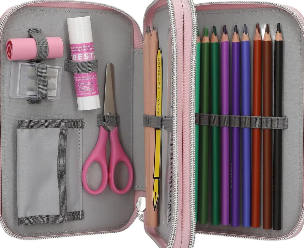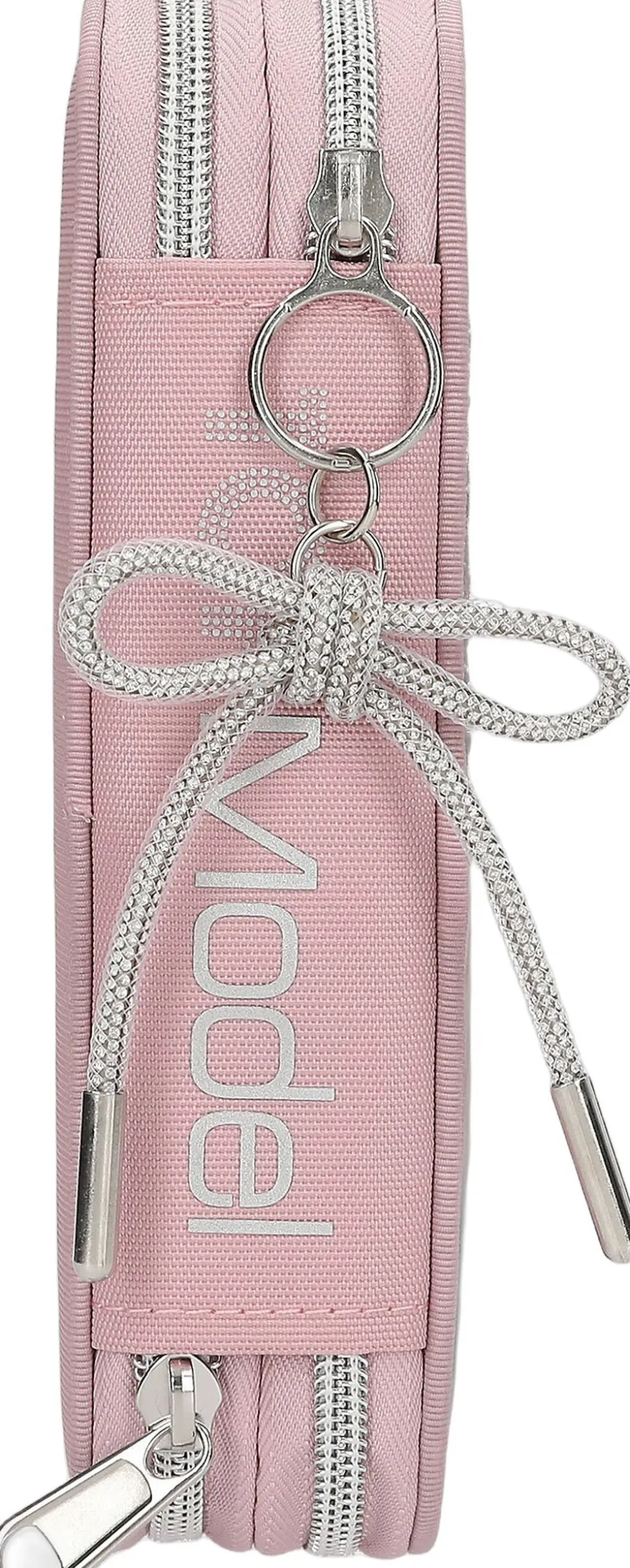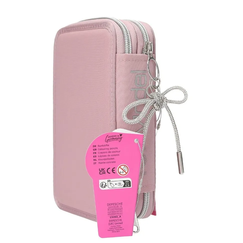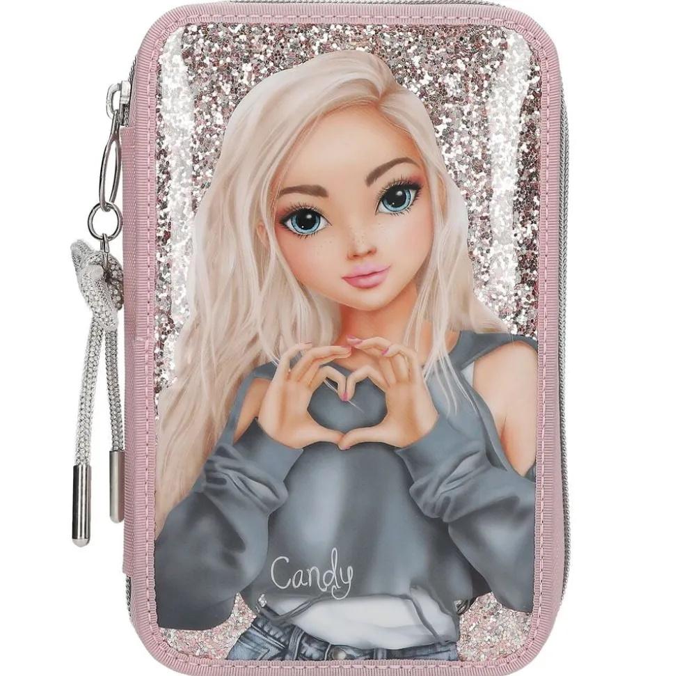 Super sødt penalhus i rosa og grå fra TOPModel serien MY BFF har et flot motiv af TOPModellen Candy på forsiden på en glitrende metallisk baggrund og med en sto r, glitrende sløjfe som sødt lynlåsvedhæng Penalhuset er opdelt i to separate rum og indeholder 2 blyanter, 1 blyantspidser, 1 viskelæder, 1 lineal, 1 saks, 1 l imstift og 18 farveblyanter Mål: 5 x 12,5 x 20 cm