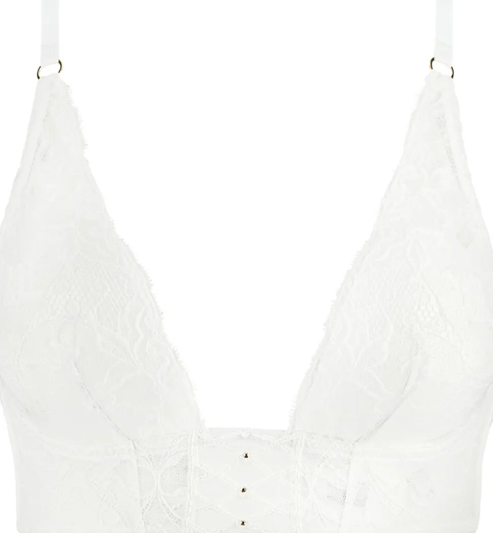 Kiss of Love ikke-fortrådede trekantsbralette er let og moderne og har gennemsigtige blomsterblonder, der strækker sig op til skuldrene. Den skaber en fantastisk spaltning og har sexet sammenvævet broderi mellem kopperne. Under busten sikrer et dybt underbånd i bustier-stil komfort og støtte for et grundigt sofistikeret look.