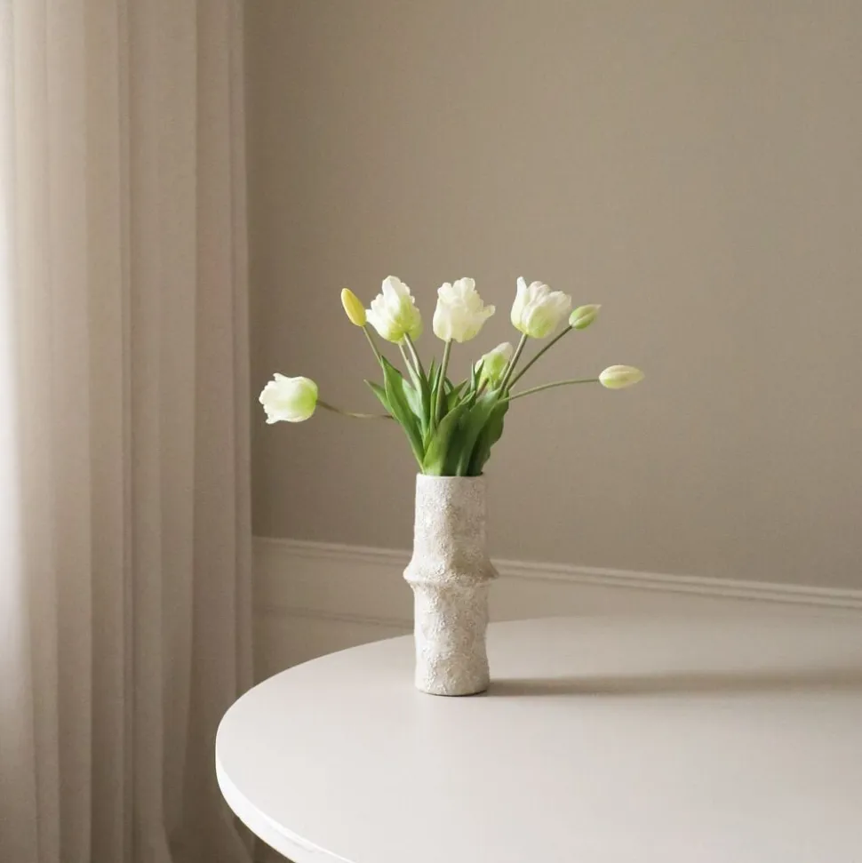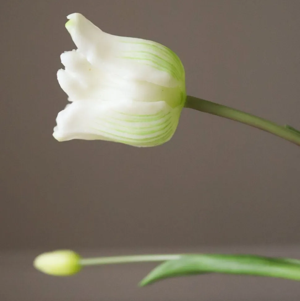 Denne buket viser bløde hvide tulipaner med strejf af grøn, arrangeret for at fremhæve deres elegante, buede kronblade. Den blide kontrast mellem kronbladene og de friske grønne stilke forbedrer sammensætningens naturlige charme. Bomet når en højde på 44 cm på sit højeste punkt, men alle stilke kan let bøjes og justeres for at opnå den ønskede højde og form til ethvert arrangement. Den lille keramiske jordvase på billedet måler 24,5 cm i højden og 8 cm i diameter.