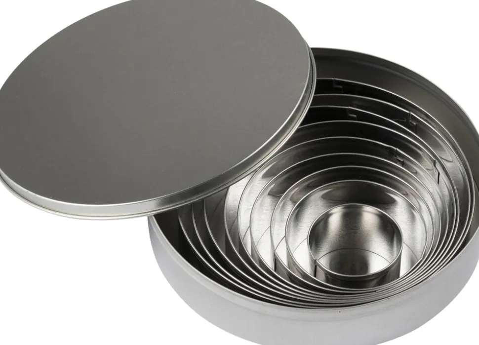 Udstikkersæt med 9 runde, glatte udstikkere i rustfrit stål, praktisk samlet ilækkermetaldåse. Det perfekte sæt til at udstikke små bunde til kager og desserter, medaljebunde, marcipanskilte, småkager og lignende i forskellige størrelser.