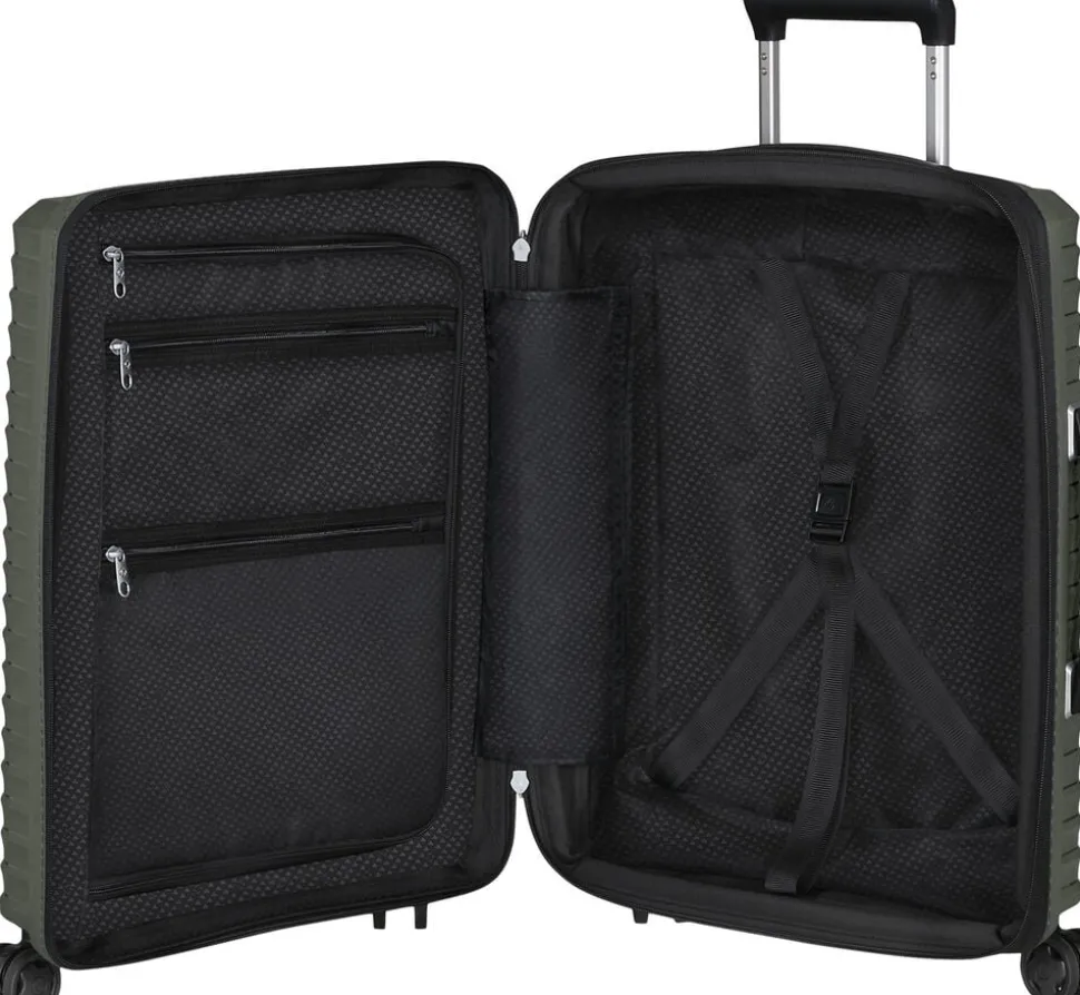 Kabinekuffert med mulighed for udvidelse, polypropylen,4 hjul,TSA lås , indvendig stofforring lavet af genbrugte plastflasker, dobbelt trollystativ, navneskilt, vægt 2,3 kg,rumindhold 39/45 l, 5 års garanti,55x40x20/23 cm.