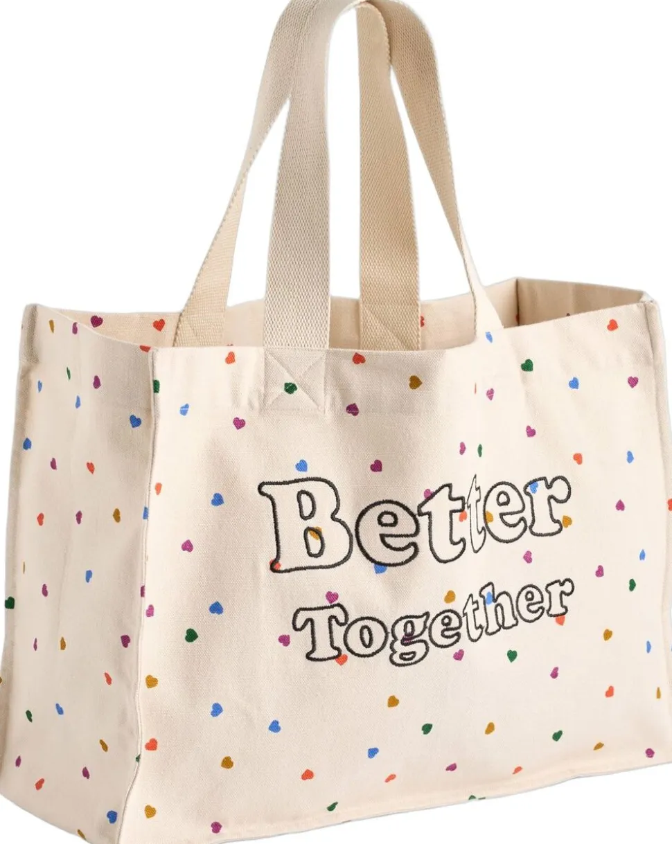 Tote bag i ubleget bomuld med et farverigt hjerte- og tekstprint, perfekt til hverdagens eventyr. Denne alsidige taske måler 38 cm i bredden og 28 cm i højden, hvilket gør den ideel til opbevaring af bøger, legesager eller snacks. Designet med komfort i tankerne, sikrer den nem bæring, mens den tilfører et legende præg til ethvert outfit.