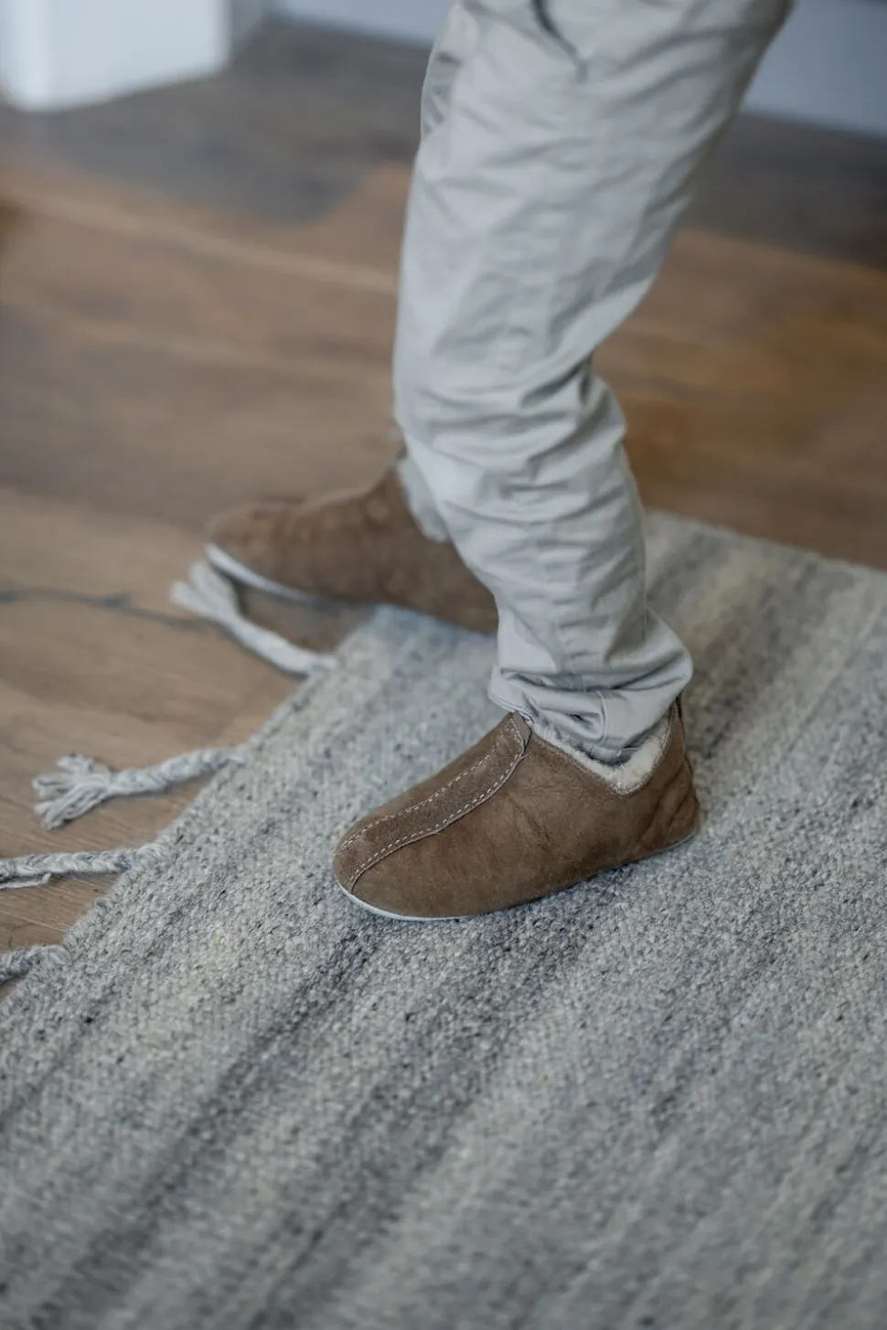 Shepherd Viared. Børnesutsko i fåreskind. Sutskoene er udformet i en lav, ankelhøj model med en lille slids i siderne, hvilket gør dem lette at tage af og på. Dekorative kantbånd i ruskind og en strop bagtil. Blød sål i ruskind.