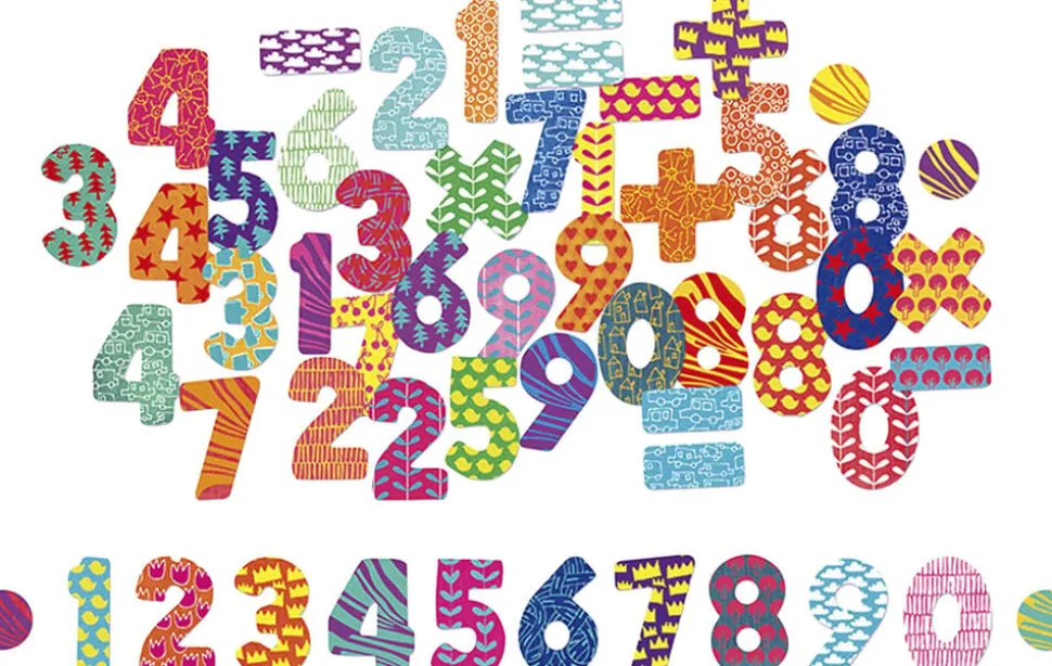 Farverige træmagneter med tal og symboler. Leveres i flot trææske med gennemsigtigt plastiklåg. Kan bruges både til leg og læring.