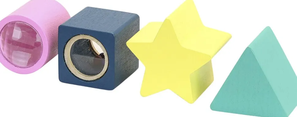 4 farverige former med effekter: kaleidoskop, maracas, stjerne og trekant med lyd.