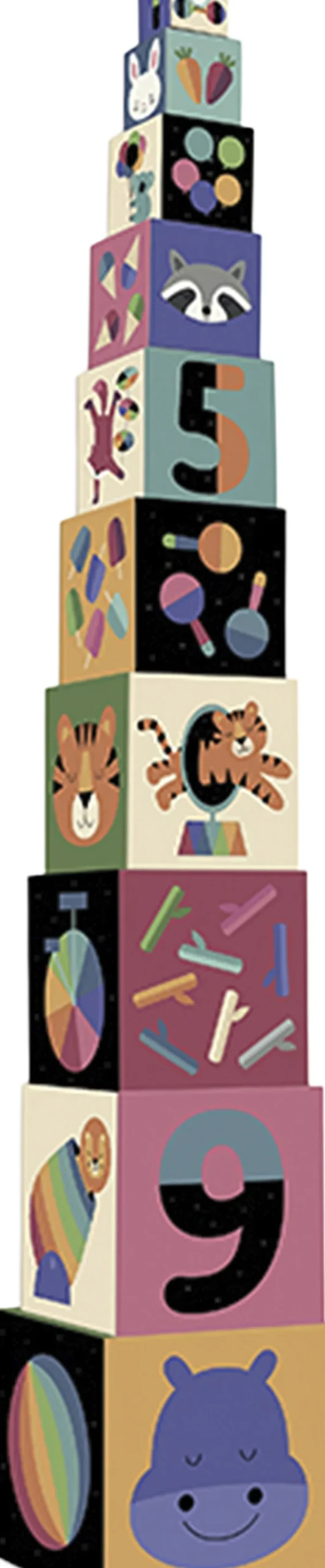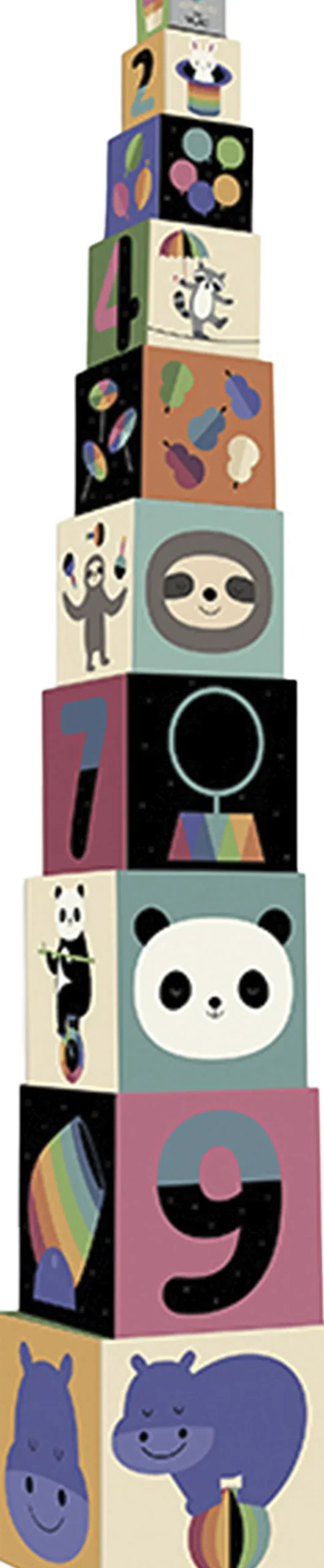 10 kraftige stableklodser i pap, som er illustreret med poetiske regnbuefarver og sjove overraskelser på hver side af Andy Westface. Med stableklodser kan børn kan sortere efter størrelse og farve, bygge, observer og tælle.