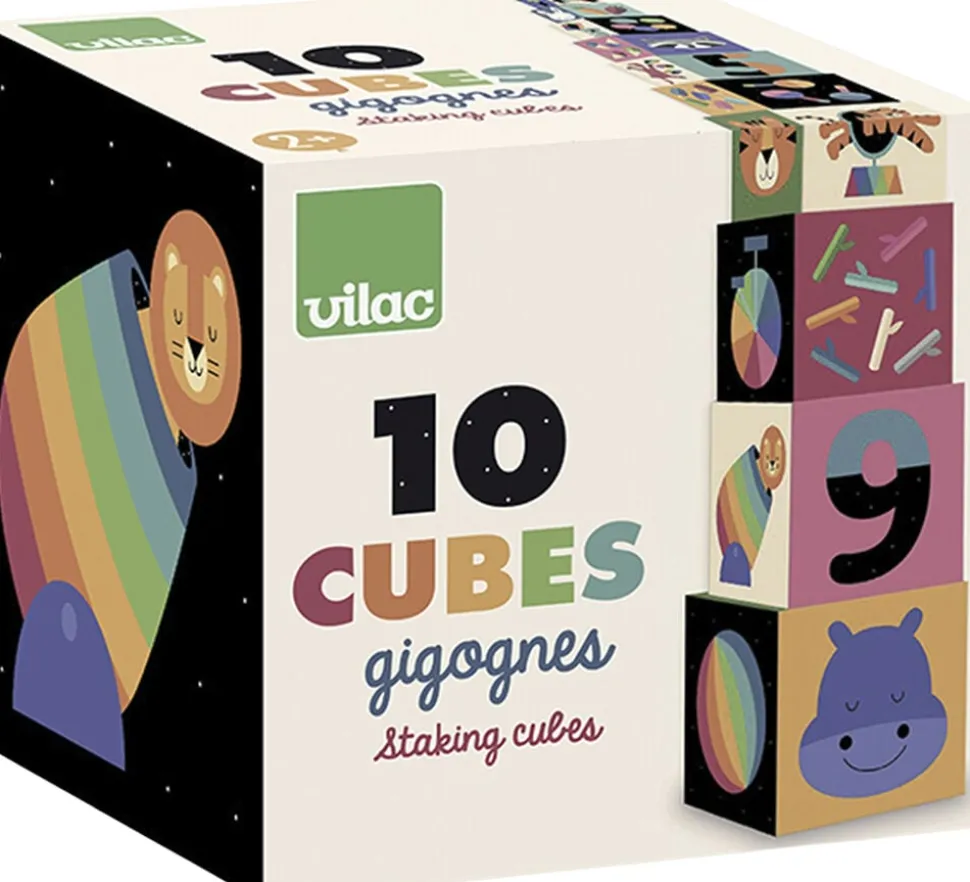 10 solide og lyse stableblokke med illustrationer på 5 sider.