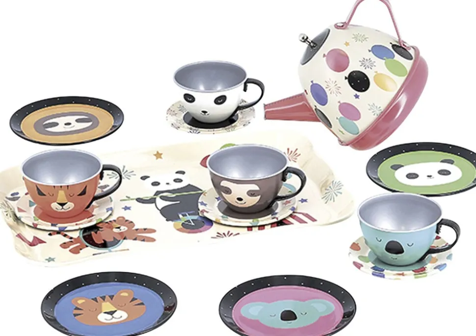 Kopper, underkopper og de 4 tallerkner passer sammen i sæt sammen med tekanden og serveringsbakken. Alle dele er illustreret med cirkustema som for eksempel en panda, en tiger, en koalabjørn og et dovendyr, som optræder i en cirkusforestilling.