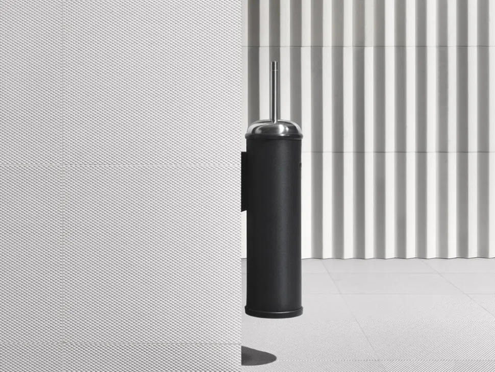 Vipp toiletbørsten med ophæng er fremstillet i rustfrit stål. Den kan nemt af- og påmonteres vægbeslaget, der er udstyret med en låsemekanisme. Børstehovedet og inderrøret kan udskiftes. En gummiring i toppen sikrer at børsten lukker tæt, mens ekstra tyngde i bunden sikrer god stabilitet.