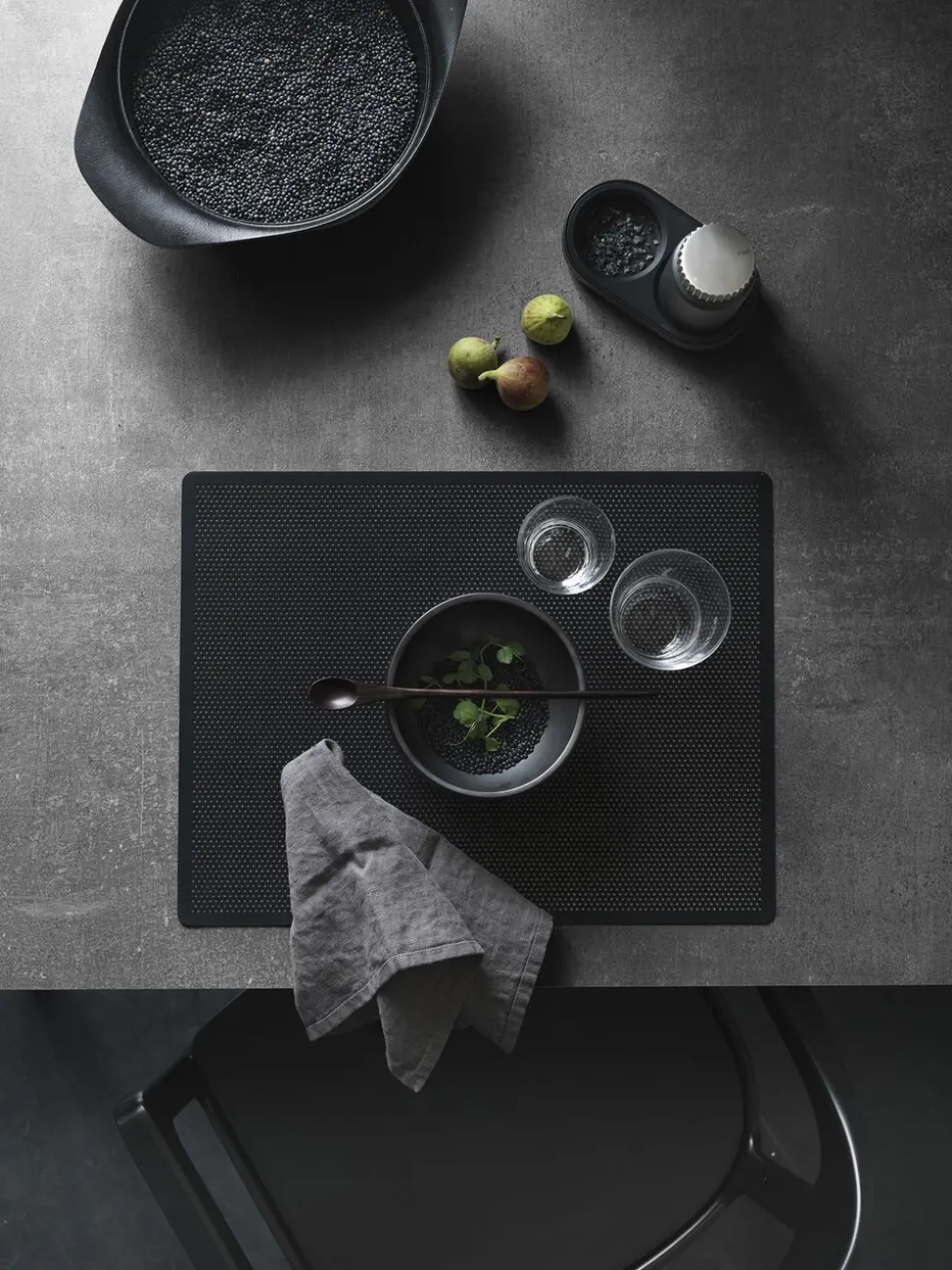 Det er kundernes efterspørgsel, der har fået Vipp til at udvikle dækkeservietten, der er fremstillet i blødt silikonegummi. Vipp dækkeservietten tåler maskinvask. Må ikke vaskes sammen med tøj, der indeholder metalgenstande som knapper eller lynlåse.