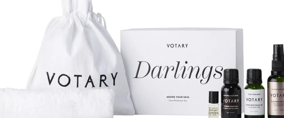 Elsk din hud. En rejseklar, smuk samling af Votarys kultklassikere. Det indeholder fire miniaturer af de bedst sælgende produkter og er perfekt til ferier, lange weekender, en generøs gave eller for at teste, og åh så pragtfuldt kært!Darlings gave sæt indeholder Rose Geranium and Apricot Cleansing Oil 30 ml – Den originale kultklassiske renseolie til smuk ren, blød, smidig hud.Super Seed Facial Oil 15 ml – Den meget elskede, duftfrie ansigtsolie fremstillet med den naturlige kraft fra 22 forskellige frøolier.Intense Night Oil 15 ml – Votarys foryngelsesmiddel natten over med højpotent Retinoid til at løfte, opstramme og genoprette huden, mens du sover.Intense Eye Oil 2 ml – Votarys specialist øjenolie til at løfte, opstramme og genopfylde den delikate hud omkring øjnene.Votary Face Cloth – En blød, 100% bomuld, uberørt hvid ansigtsklud, der hjælper med at fjerne snavs, eksfolierer forsigtigt og aktiverer al godheden i Votarys formler.Votary Cotton Bag – Til at putte dine Darlings i, når du er på farten. ADORE YOUR SKINAdore your skin. A travel-ready, beautiful collection of our cult classics. It contains four miniatures of our best-selling products and is perfect for holidays, long weekends, generous gifting or trialling, and oh so gorgeously dinky!.Darlings Gift Set contains Rose Geranium and Apricot Cleansing Oil (30ml – 1.01fl oz) – Our original cult classic cleanser for beautifully clean, soft, supple skin.Super Seed Facial Oil (15ml – 0.51fl oz) – Our much loved, fragrance free facial oil made with the natural power of twenty two different seed oils.Intense Night Oil (15ml – 0.51fl oz) – Our overnight rejuvenator, made with potent retinoid to lift, firm and restore as you sleep.Intense Eye Oil (2ml – 0.07fl oz) – Our specialist eye oil to lift, firm and replenish the delicate skin around the eye socket.Votary Face Cloth – Our soft, 100% cotton, pristine white face cloth, to help remove grime, gently exfoliate, and activate all the goodness in our Votary formulas.Votary Cotton Bag – To pop your Darlings in when you’re on the move.