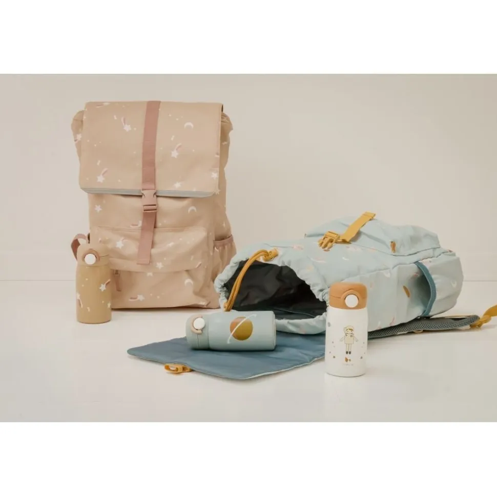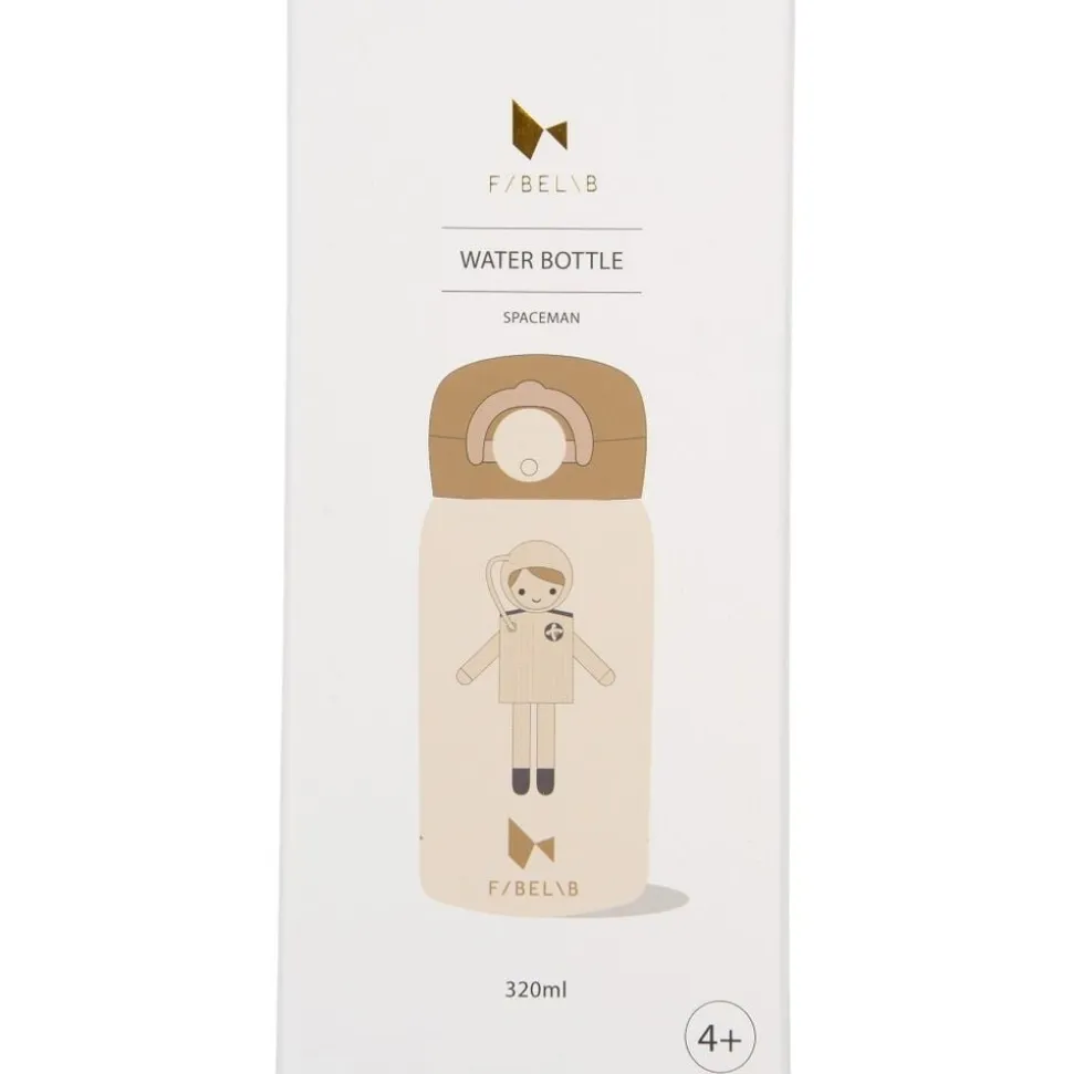 Fabelabs vandflaske er perfekt at tage med på farten eller i børnehaven og skolen. Vandflasken er nem for de små at bruge og drikke af med den nemme, men sikre åbning, der forhindrer, at vandflasken åbner sig inde i skoletasken. Der er tilføjet en drikketud til sikker drikke og den passer perfekt ind i siderne på vores nye Rygsæk – Stor. Vandflasken rummer 320 ml og er lavet af 18/10 kvalitets rustfrit stål og BPA-fri PP plastiklåg og silikonesegl. Vandflasken holder drikkevarer kolde i 24 timer og varme i 10 timer og hverken optager eller afgiver smag ved brug. Pleje og brug: Vask vandflasken i koldt eller varmt vand med en blød svamp eller børste for at rengøre indersiden. Hold vandflasken ren for at undgå lugt og opbevar vandflasken uden skruelåg for optimal tørring. Til grundig rengøring kan du fylde vandflasken med varmt vand indeholdende 10 % eddike i 30 minutter og endelig rengøre med rent vand og en blød børste. Forsigtighed: Brug den ikke til kulsyreholdige drikkevarer, salte supper osv. Rengør ikke vandflasken i opvaskemaskinen, da det reducerer den termiske effekt. Brug ikke slibemidler eller slibende rengøringsmidler. Mad sikker – EU-standard, LFGB – Test af fødevarekvalitet, DG CCRF – Test af fødevarekvalitet. Ikke egnet til børn under 4 år