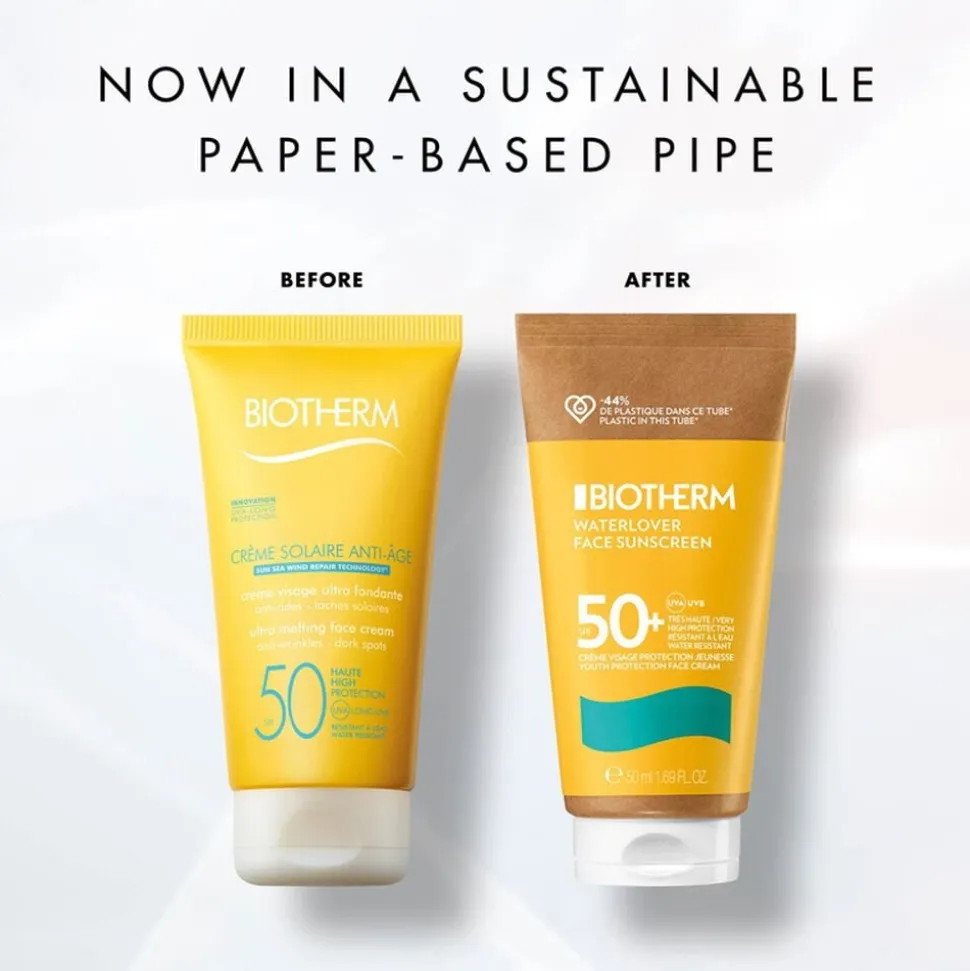 Biotherm Waterlover Creme Solaire Anti-Age SPF50 50ml til ansigtet er en solcreme i en bæredygtig papirbaseret tube. Kan anvendes af alle uanset hudtype. Beskytter effektivt mod solen (UVA & UVB). Beriget med E-vitamin og antioxidanter, der virker helende på huden samt beskytter mod frie radikaler, som nedsætter ældningsprocessen. Et særligt anti-age solfilter er tilføjet, som mindsker chancen for dannelsen af pigmentforandring/pigmentpletter. Cremens konsistens trænger hurtigt ind i huden uden at efterlade hvide mærker. Indeholder duftnoter af citrusekstrakter.