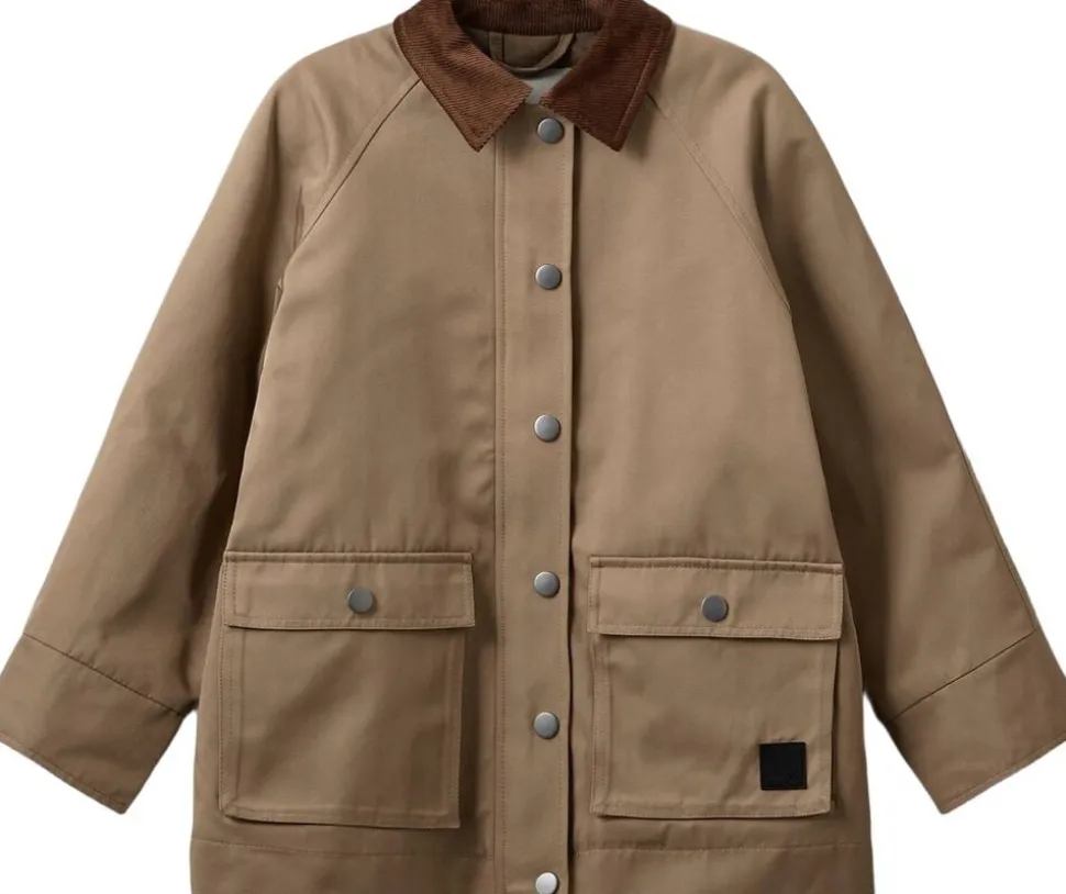 Beige klassisk jakke med fløjlskrave, raglanærmer, knaplukning, forlommer med knaplukning og logodetalje og skjult lynlås