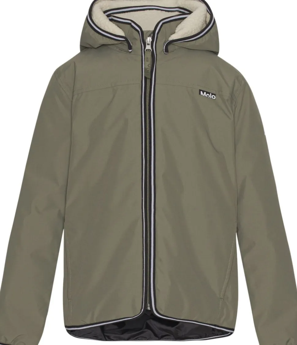 Smart mørkegrøn vind- og vandtæt allround jakke. Jakken har en fleeceforet aftagelig hætte, lommer i siderne, elastik ved ærmerne, og har den velkendte Molo stjerne refleks bagpå samt på det ene ærme, så børnene ses i mørket. Bukserne har desuden foret med en invendig flat padding, som gør dem bløde og hjælper til at holde på varmen. Ydermateriale, for, samt inderstof er fremstillet af delvist genanvendt polyester fra brugte plastikflasker og andet restaffald.Herved bruges der langt færre ressourcer samt en væsentlig mindre udledning af CO2.Miljøvenlig vand- og smudsafvisende coating uden brug af kemikalier som PFOS, PFOA og lign. Vandsøjletryk: 5.000 mm. Åndbarhed: 5.000 g/m2/24t.