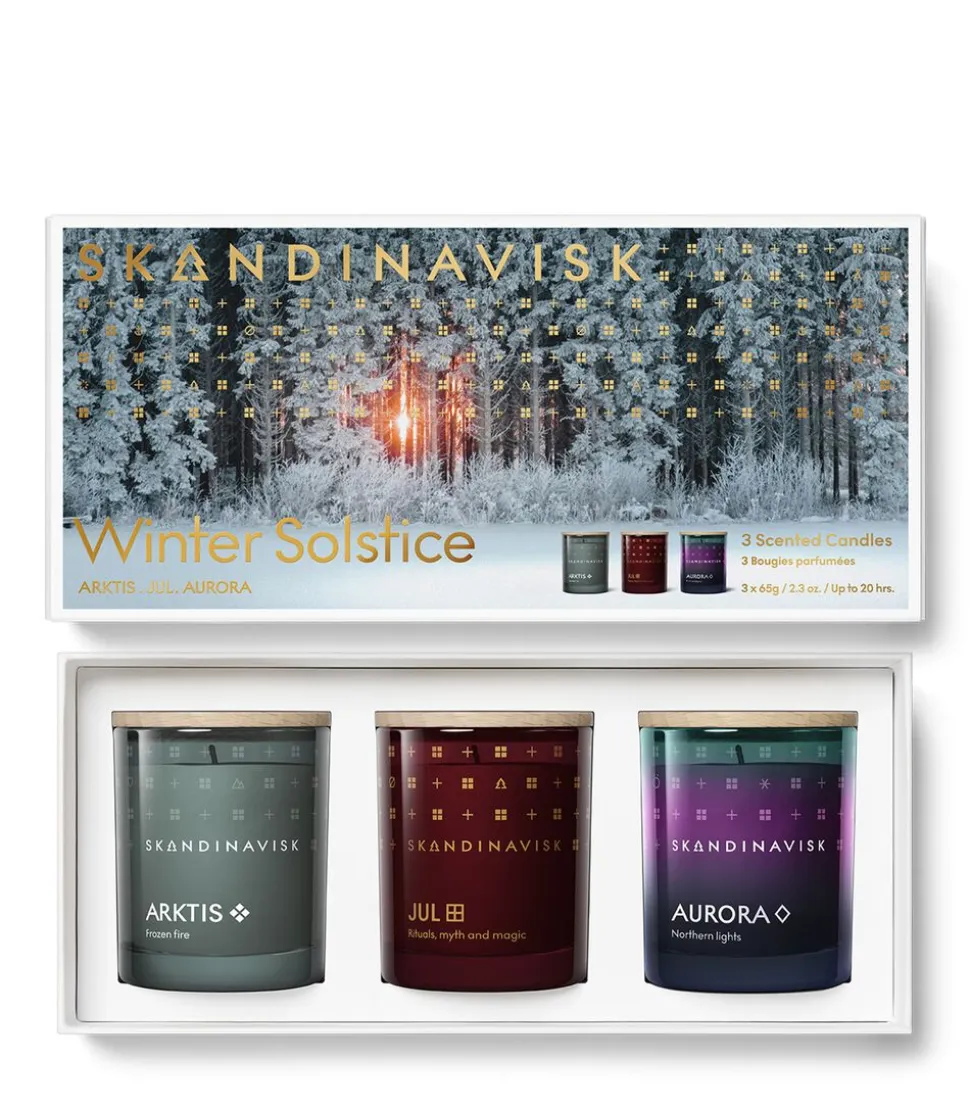 AURORA Duftnoter: Sandeltr? og eneb?r, jasmin og lime. JUL Duftnoter: Bagte honningkager, nelliker, krydret appelsiner og gl?gg. ARKTIS Duftnoter: Vindblåst tr?, Salvie fra den Arktis, Spearmint og snefnug. 3 duftlys af svensk rapsvoks med indgraveret b?getr?sl?g. AURORA, Magisk, undvigende, udefinerbar. Nordlysene er et af naturens syv vidundere, en symfoni af farver, bev?gelse og dimension, som gamle nordiske kr?nikeskrivere engang troede var soludbrud, store havbrande eller glacialt fluorescerende lys. SKOG – Svensk/Norsk for skov. Skove dækker mere end halvdelen af de Skandinaviske lande og strækker sig fra den sydligste del af Sverige op til den arktiske cirkel. ARKTIS – Norwegian/Danish for Arctic. Det frosne og vidtstrakte landskab forenet gennem, Norge, Sverige og Finland er lige dele friskt og betagende som det er afsides og fjendtligt. En blanding af mere end fem ?teriske olier.