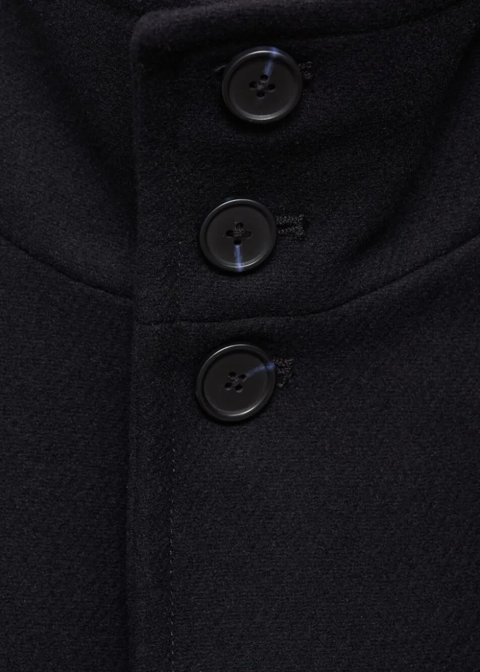 Uldblanding, smal pasform, medium længde, krave med knapper og knaplukning, knaplukning foran, to paspolerede lommer foran, lange ærmer med knapper ved manchetterne, indvendig foring.